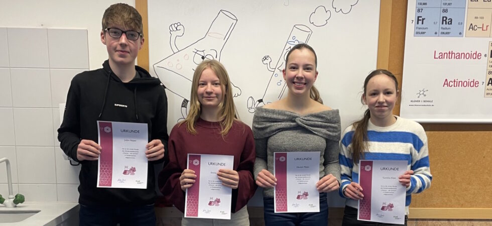Seit zehn Jahren sind wir regelmäßig beim niedersächsischen Experimentierwettbewerb „Das ist Chemie“ dabei, im vergangenen Durchgang mit insgesamt 76 Teilnehmerinnen und Teilnehmern in 35 Gruppen. Rahel, Amelie, Celina, Katja (alle ehem. 5d) sowie Friederike,...