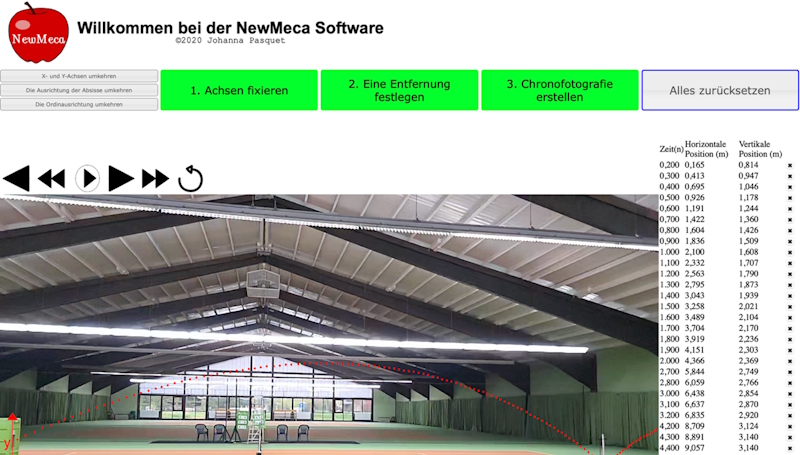 Als Analysetool habe ich die NewMeca-Software benutzt. NewMeca ist ein manuelles Motion-Tracking-Tool, das auf Pointage und Trassierung basiert. Es wird vor allem zur Videometrie und kinematischen Analyse eingesetzt, wobei durch ein Maßstabobjekt die Skalierung ermöglicht wird. Dadurch lassen sich reale Bewegungen anschaulich als Chronofotografie untersuchen und physikalisch interpretieren. Dafür brauchte man ein Video von der Flugbahn des Objektes. In diesem Video sollte der Ball in jedem Frame gut zu erkennen sein und die ganze Flugbahn sollte im Bild sein, sofern man die ganze Flugbahn analysieren möchte.