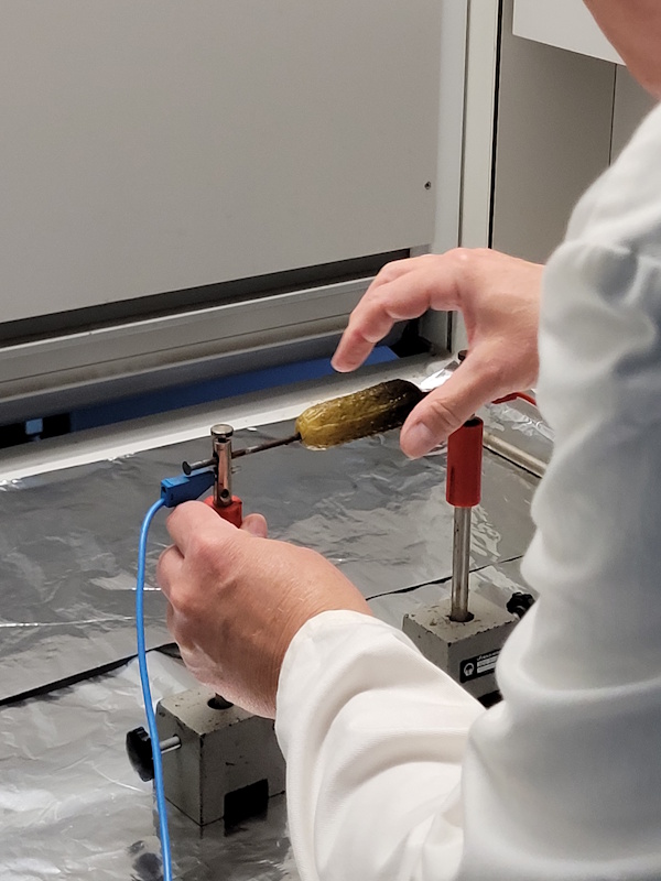 Was passiert, wenn man eine Gewürzgurke unter Spannung setzt? – Diese Frage sorgte neulich in unserer zweiten MINT-Pause für neugierige Blicke und ein paar skeptische Stirnrunzler. Doch kaum war der Strom angeschlossen, wurde aus der unscheinbaren Gurke ein leuchtendes Phänomen: Sie begann zu glimmen, zu knistern und verströmte einen leicht verbrannten Duft – ein echtes Spektakel!