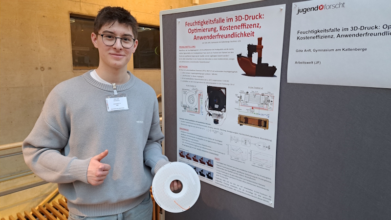 • Projekt „Feuchtigkeitsfalle im 3D-Druck“ von Götz (Jg. 13, Gd) – 1. Platz im Fachgebiet Arbeitswelt und Qualifikation für die Landesrunde